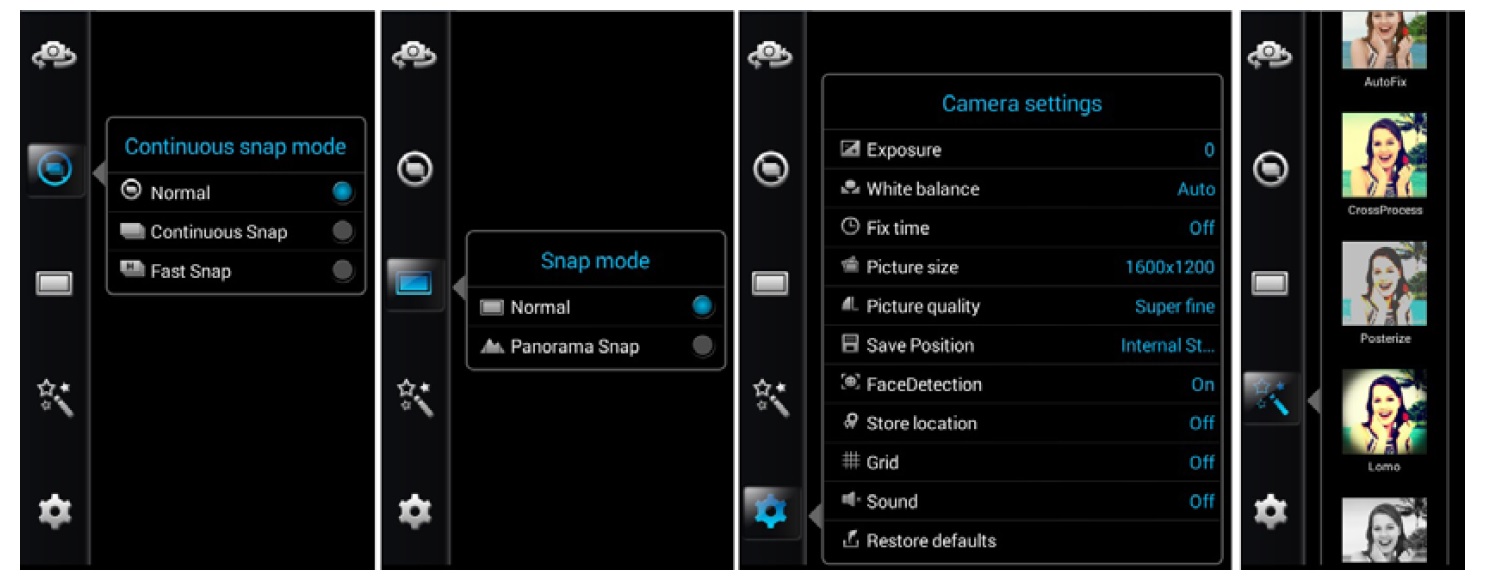 Rear camera take photo 1600x1200 pixels, GPS tags or patterned lines can be inserted, you can re-select the storage location; select panoramic photo, press the shutter button, gently move the camera horizontally, with the progress bar going to the end, panoramic photo shoot completed.