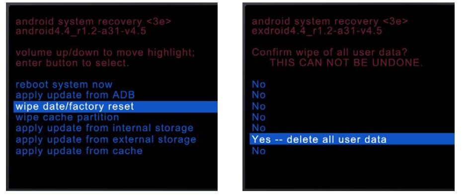 4- In this interface, press the left side volume key to perform up operation and the right side volume key to perform the down operation, the power button to perform confirm OK, press twice on the right side volume key to select wipe data / factory reset, press the power button to confirm the operation and then go to the next interface.