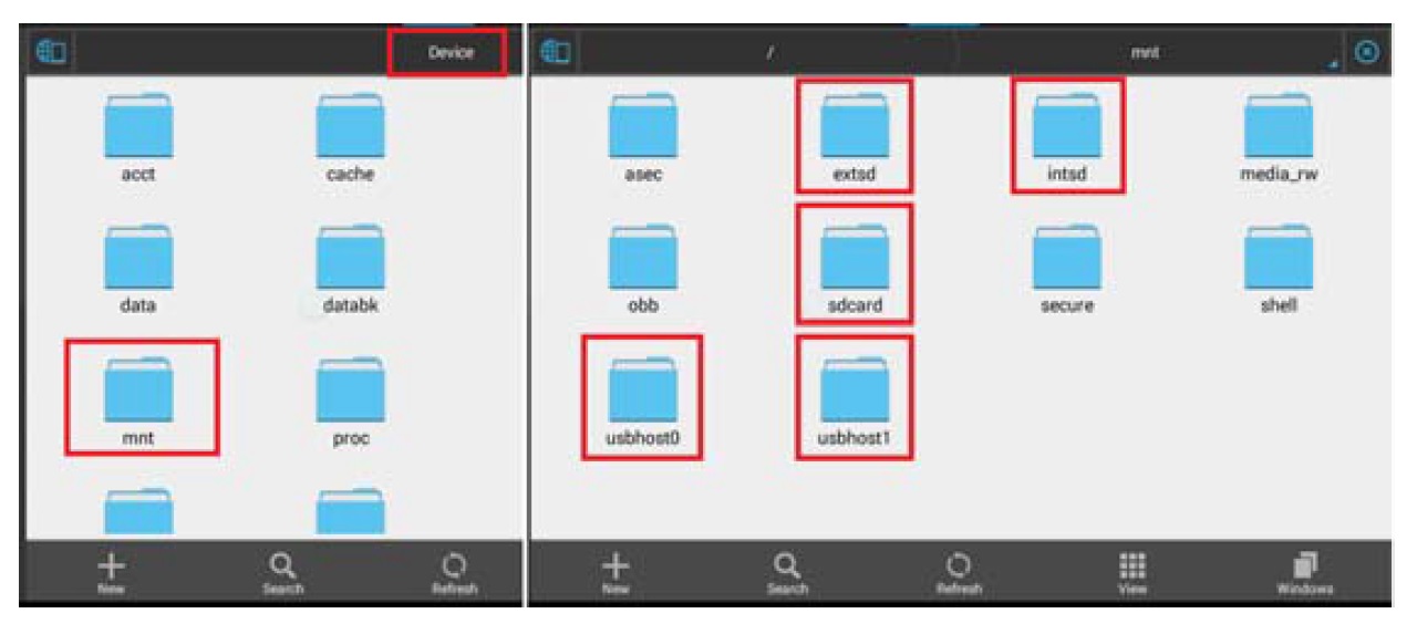 Please enter the filer device root directory, select mnt, enter the path which has stored all the storage medium, as shown below, sd card is hard 1, intsd hard disk 2, ext sd TF card, usbhost0 USB OTG interface is introduced storage media, usbhost1 storage media USB HOST interface is introduced. Click on the appropriate folder, you can browse the files in the appropriate storage media, including the models with less than 16GB, intsd is empty hard disk 2 does not exist.
