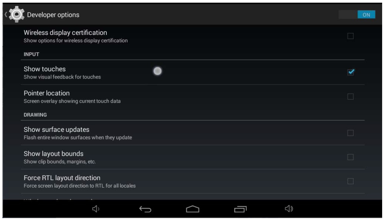When you face this phenomenon, please either wait for the network load to stabilize the situation, or to replace the use of the environment. Or open the Settings / developer option, click the display touch operation, touch operation for the user to provide a visual cue of touch points. White dots in the following figure is that when a finger touches the touch screen, touch screen actually give a touch-point response