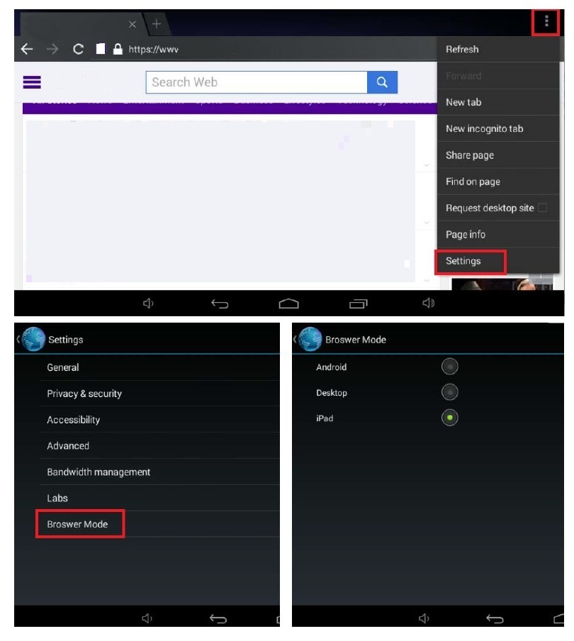 If the network and the site itself is not a problem, you can try to change the browser settings, select settings as the following chart, enter the browser mode interface, switch to the other mode, and refresh the site to see whether it’s normal display. The website opened will first check your chosen browser mode and send the corresponding data according to your selected mode, if the ipad mode is selected, the page sends data to comply with ipad patterns, but if the website does not consist with data of ipad pattern, it will not display properly.