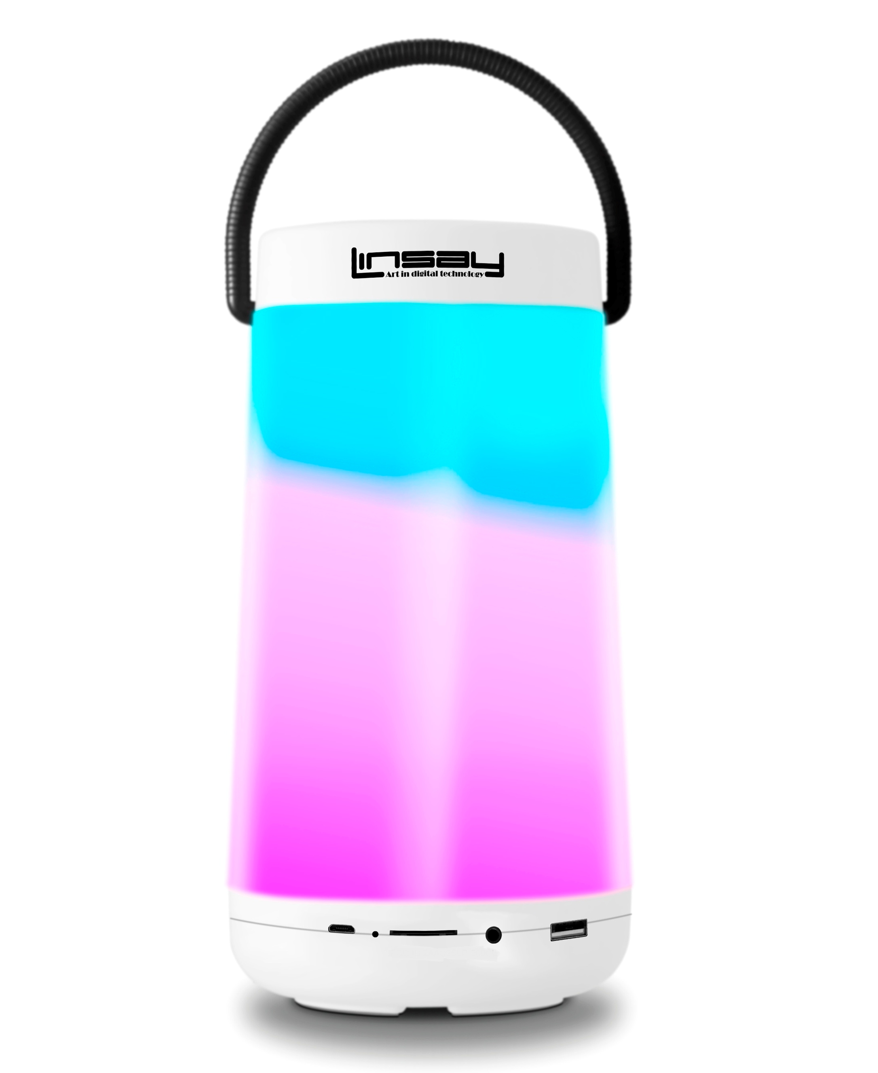 Meet the New LINSAY SLP-500CW LED Light Show Indoor/ Outdoor Portable Bluetooth Speaker White which features 10 multi colorful LED lighting. Place it outdoor to brighten your surroundings with a 360° multi light show. Including a 360° surrounding sound to experience an exciting listening show. Loud and Deep sound by our latest Bluetooth technology to guarantee a efficient music streaming.